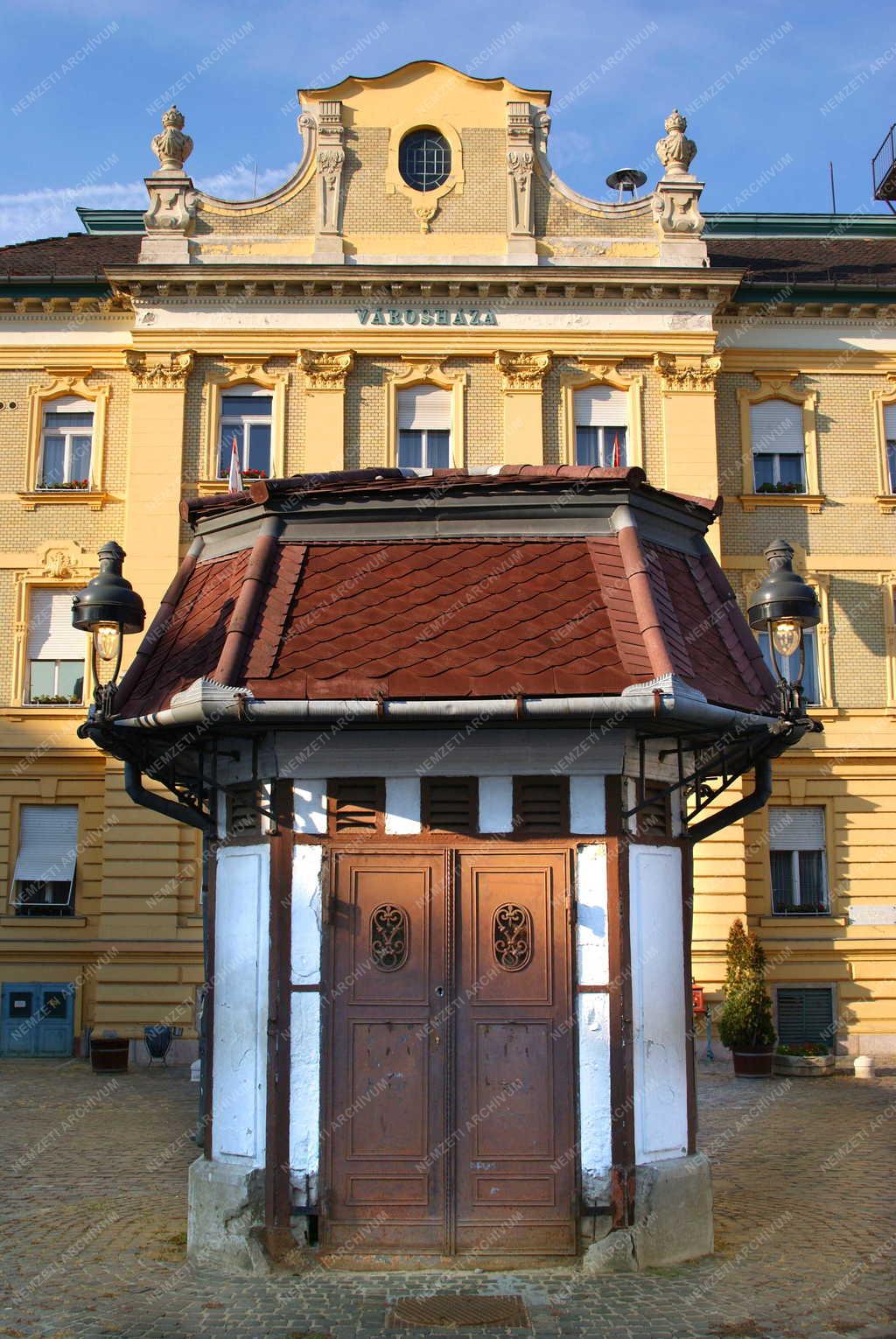 A Városháza 1906-ból származó épülete Óbudán, a Fő téren. Előtte aprócska házikót láthat a járókelő, az egykori gázfogadó (gázátadó állomás) üzemépületét, amelynek tetején megcsodálhatók a régi köztéri gázlámpák.