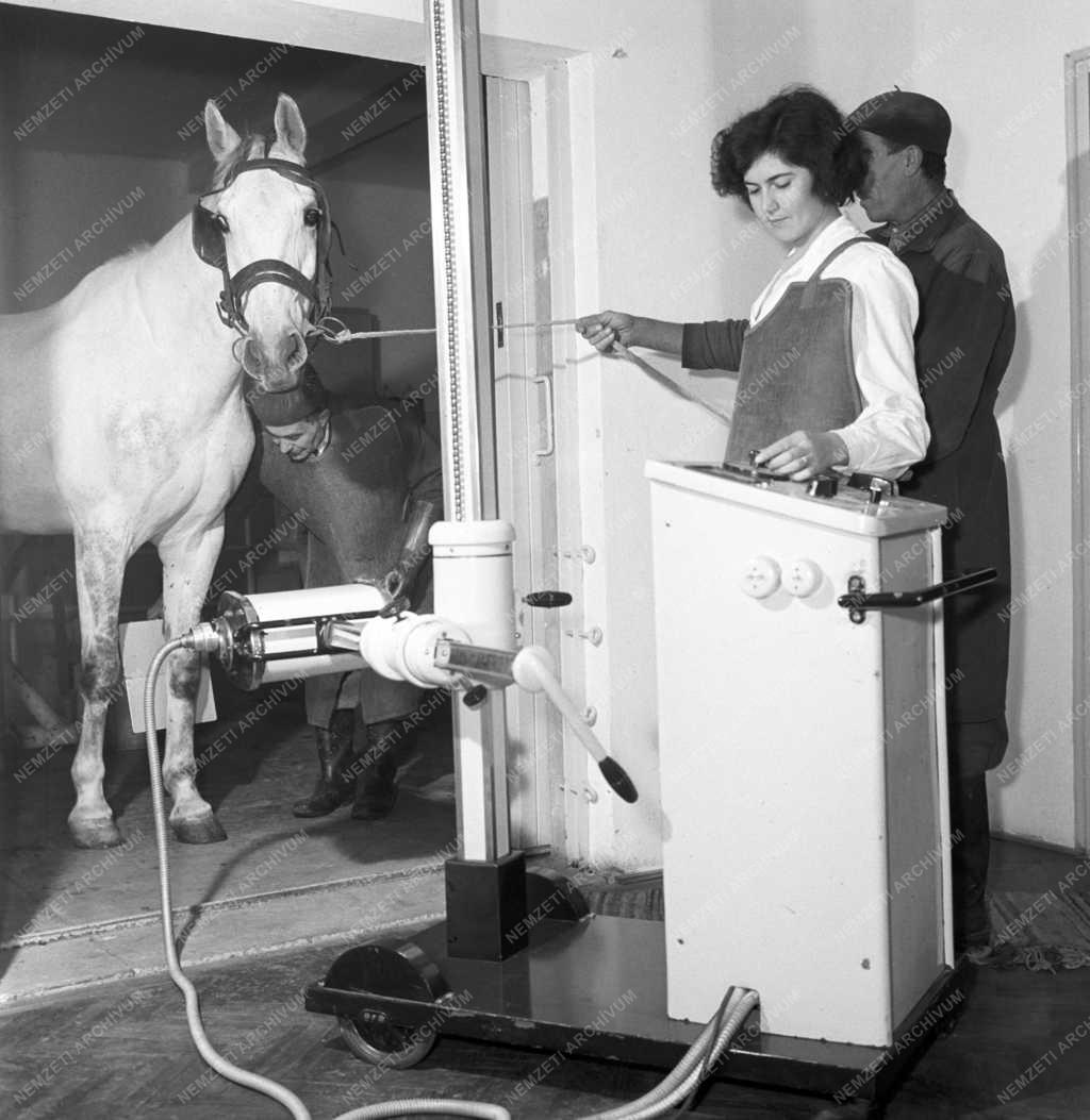 Röntgen készülékkel vizsgálnak egy lovat az Állatkórház rendelőjében.