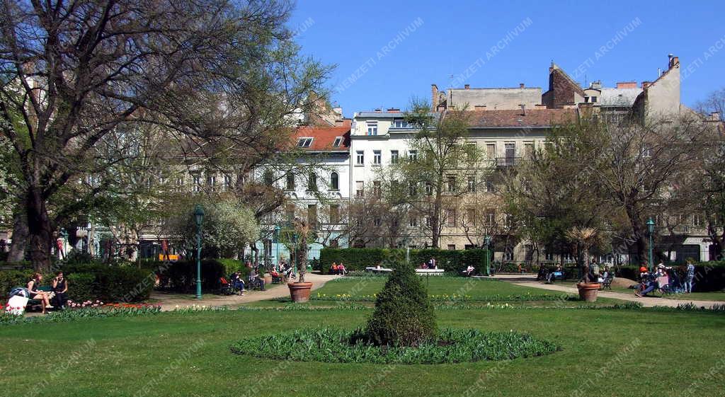 Fővárosiak pihennek, beszélgetnek a ma közparkként szolgáló Károlyi-kertben, a Károlyi-kastély (ma a Petőfi Irodalmi Múzeum) egykori parkjában, a főváros V. kerületében.