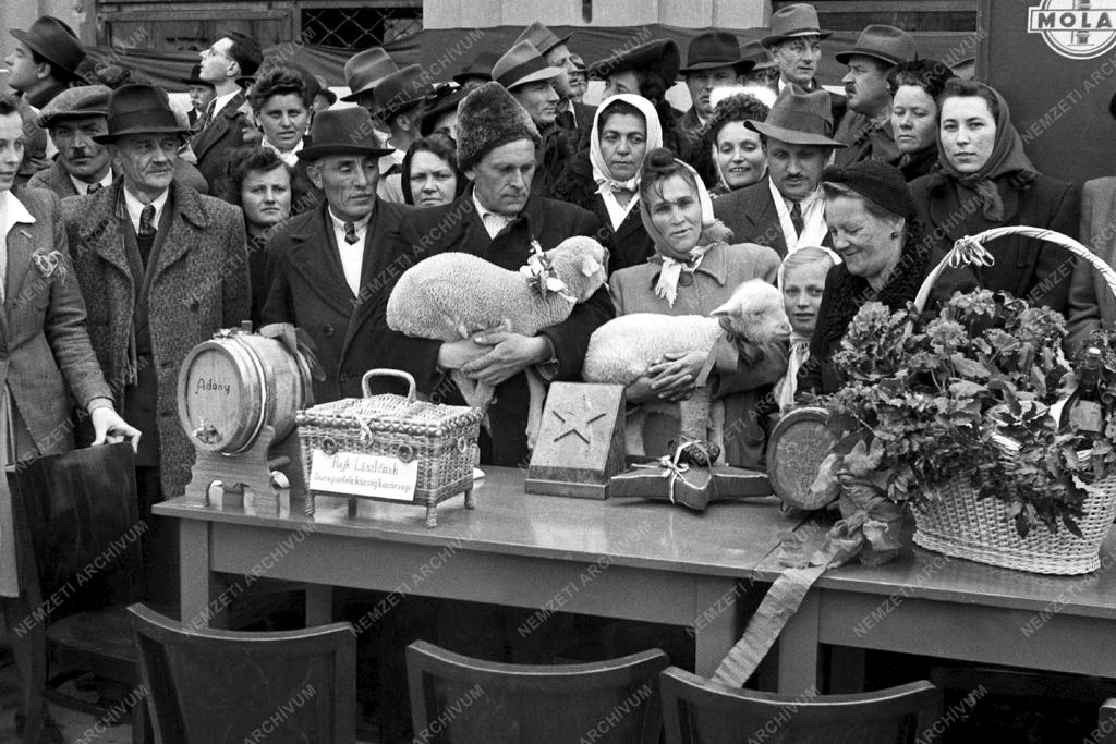 A gyűlésen a parasztok, a népi hagyományoknak megfelelően, borral, kenyérrel, báránnyal, virágkosárral köszöntik Rajk László belügyminisztert. A kormány fontos politikai célkitűzése megismertetni az emberekkel a valós politikai helyzetet és ország előtt álló gazdasági feladatokat. Ennek érdekében országszerte nagygyűléseket tartanak.