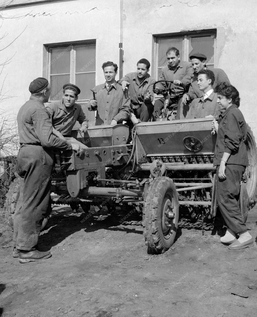 Somodi János, a Soroksári Tangazdaság szerelője a vetőgép szerkezetét mutatja meg az Egyesült Arab Királyságból érkezett mezőgazdasági főiskolásoknak, akik a nagyüzemi gazdálkodást tanulják meg Magyarországon.