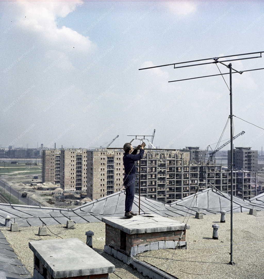 Szakember szereli a televíziós antennát az épülő lágymányosi lakótelep egyik Schönherz Zoltán utcai (1992-től Október huszonharmadika utca) házának tetején.