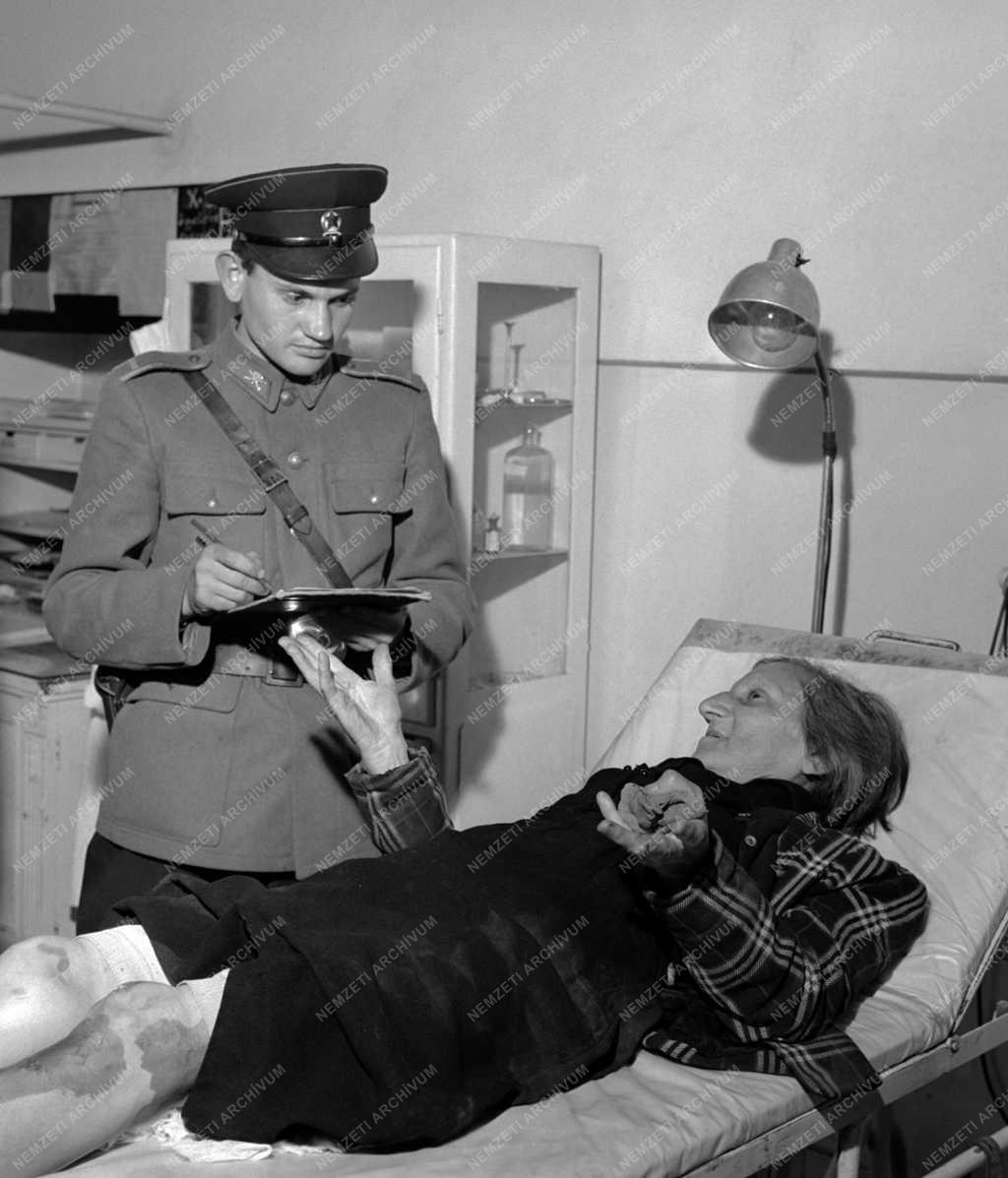 A Budapesti Rendőrfőkapitányság Közlekedésrendészeti Főosztály baleseti járőre kihallgatja a kórházban a sérült Dr. Fröte Vilmosnét, akit figyelmetlensége miatt villamos gázolt el a Margit híd pesti hídfőjénél. Budapesten az elmúlt három hónap alatt 936 baleset történt ebből 818 esetet a gépjárművezetők és gyalogosok szabálytalan közlekedése illetve gondatlansága okozott.