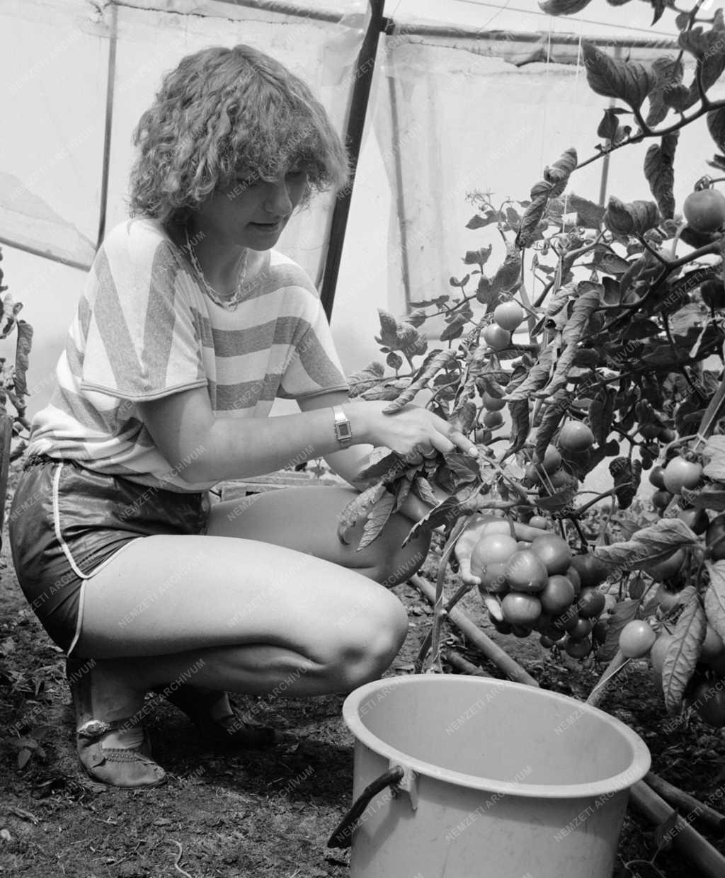 A Bujdosó család egyik nőtagja paradicsomot szed. Bujdosó László és családja 1300 négyzetméter fűtött fóliasátor alatt paradicsomot és paprikát termel a Lajosmizse-Felsőlajosi telken. A homokos, szakszerűen művelt talajon bőséges a termés, a dunántúli piacokra is szállítanak.