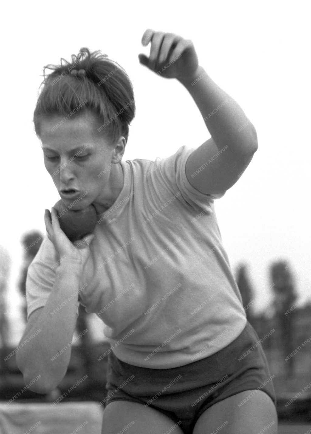 Bognár Judit, a Bp. Honvéd játékosa versenyez a Budapesti Honvéd Nemzetközi Atlétikai verseny első napján az Előre pályán. A versenyző 17.86-ra javította az országos súlylökő csúcsot (régi: 17.27, Bognár).