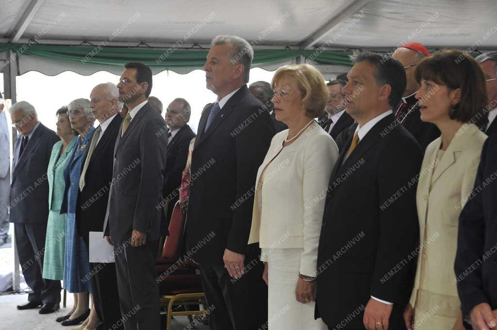 Schmitt Pál köztársasági elnök (j4) és felesége, Makray Katalin (j3), Orbán Viktor miniszterelnök (j2) és felesége, Lévai Anikó (j1) eléneklik a Himnuszt az új államfő hivatalba lépése alkalmából rendezett ünnepségen, a Sándor-palota udvarán felállított sátorban. Szabadon felhasználható felvétel.