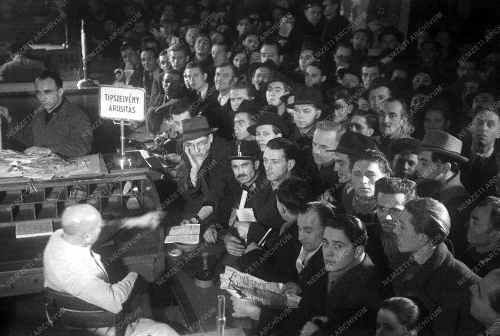 Fogadók várják a totó tippszelvények árusításának megkezdését a Postatakarékpénztár Hold utcai épületében.