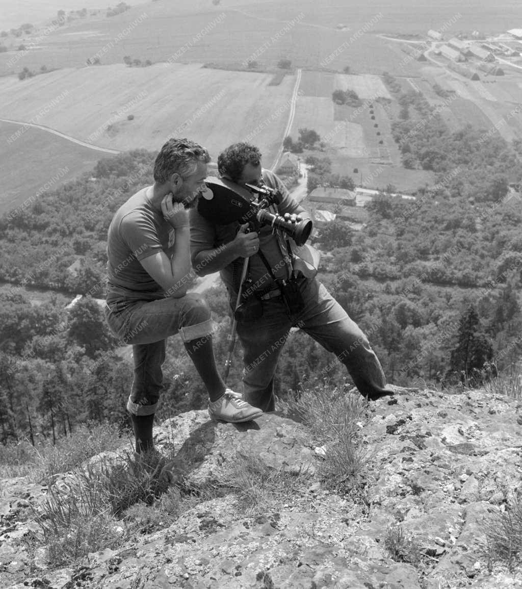 Rockenbauer Pál rendező (b) és Szabados Tamás vezető operatőr a sziklanövényeket filmezi a füzéri várhegyen. Az MTV Natúra Szerkesztősége tizenhárom részes, egyenként 30 perces sorozatot forgat az Országos Kéktúráról. A tíz fős forgatócsoport július 31. és október 15. között teszi meg az 1.083 km-es távot, naponta 15 km-t haladva.