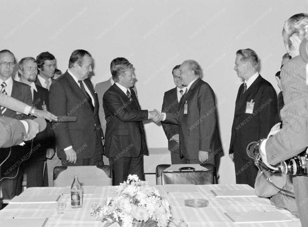 Kádár János (j3), a Magyar Szocialista Munkáspárt Központi Bizottsága (MSZMP KB) első titkára és Helmut Schmidt (b5), a Német Szövetségi Köztársaság (NSZK) kancellárja üdvözlik egymást az Európai Biztonsági és Együttműködési Értekezlet egyik szünetében. Kádár János mellett Lázár György, a Minisztertanács elnöke (j2), Helmut Schmidt mellett Hans-Dietrich Genscher, az NSZK külügyminisztere áll (b4).