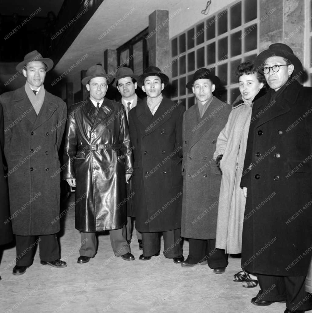He-Ok, a Koreai Népi Demokratikus Köztársaság Fogyasztási Szövetkezetek Központi Szövetségének elnökhelyettese (j) és Li In-Zin, a koreai Begyűjtési Igazgatóság vezetője (b) Szövosz vezetőségi tagok társaságában, miután megérkeztek a Ferihegyi repülőtérre. A koreai küldöttség tagjai a Fogyasztási Szövetkezetek Országos Szövetsége (Szövosz) IV. országos kongresszusának alkalmából jöttek Magyarországra.