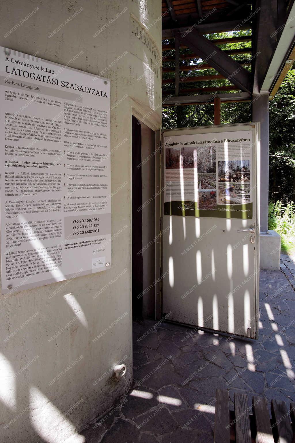 A kilátó feljárata. A Börzsöny legmagasabb pontján, (938 méter) a Csóványoson a korábbi geodéziai betonhenger köré épült az acéloszlopokon álló négyszintes kilátó, mely 22,61 méter magas. Az Ipoly Erdő Zrt. Eu-s támogatással újította fel, 2014 végén nyílt meg.