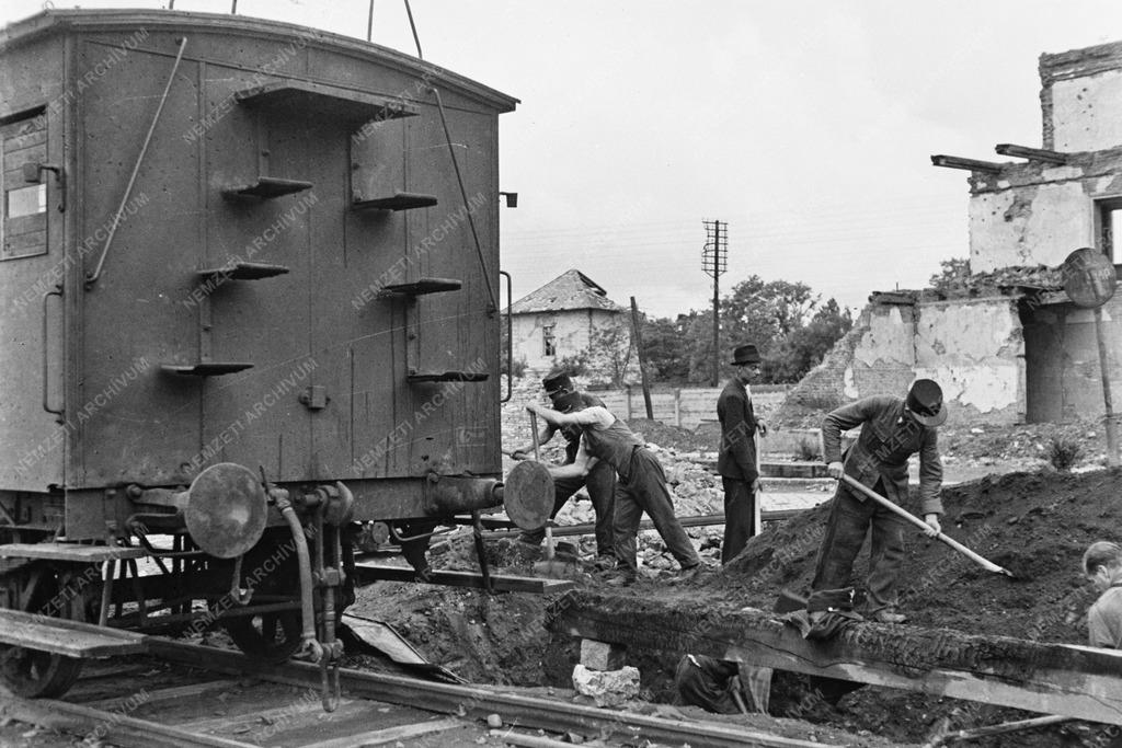 Vasúti munkások dolgoznak a debreceni pályaudvar pályatestei és a fűtőház újjáépítésén. A debreceni MÁV-létesítmények az 1944. júniusi bombázás során csaknem 300 bombatalálatot kaptak. A felvétel készítésének pontos napja ismeretlen.