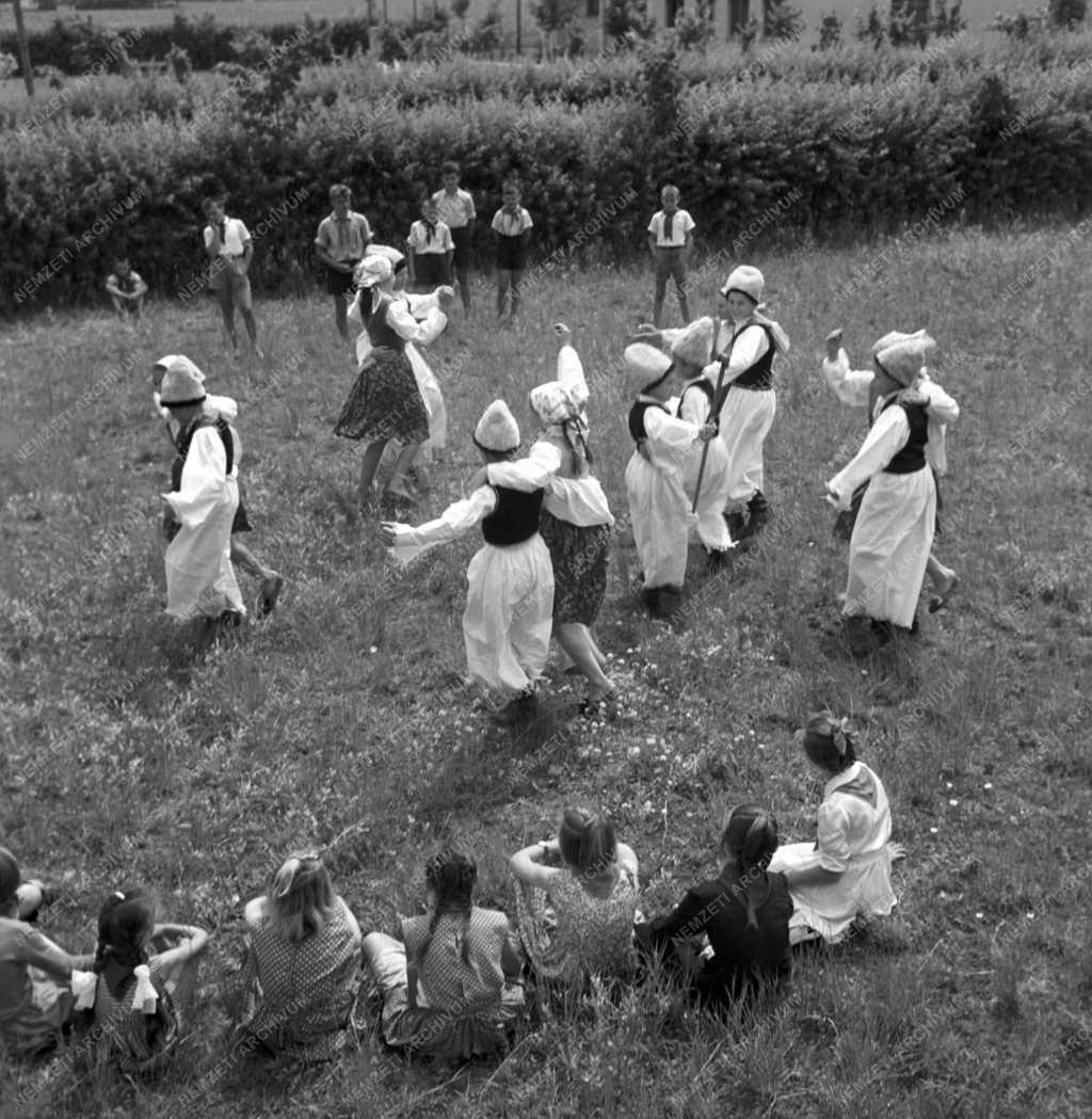 Néptáncos gyerekek táncolnak a mezőn.