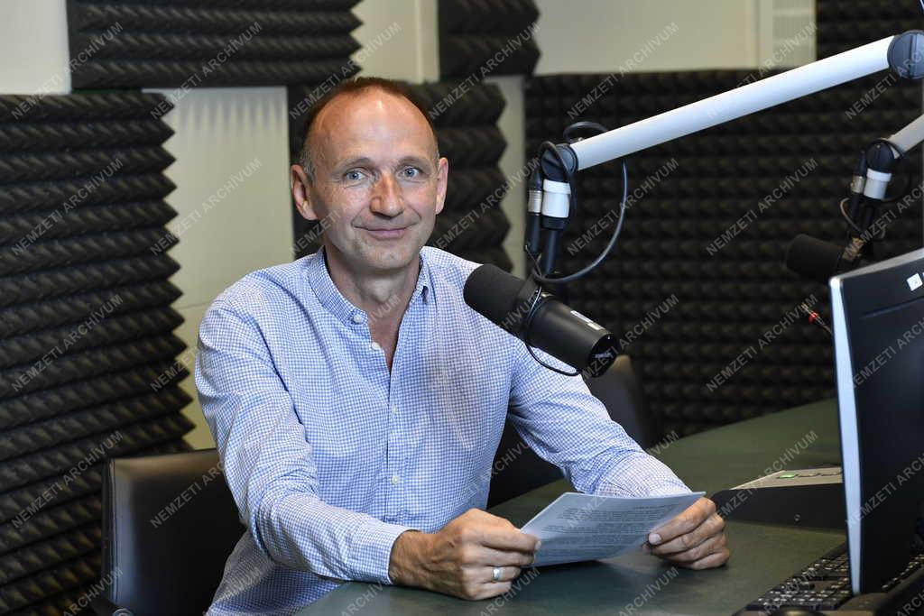 Madarász Zsolt, a Bartók Rádió szerkesztő-műsorvezetője a Lemezelő című rádióműsor felvétele előtt, az MTVA Kunigunda útjai gyártóbázisának K2 rádióstúdiójában.