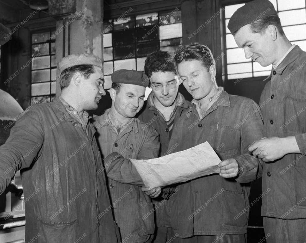 Bottka Lajos vasesztergályos, az első Ifjúsági szocialista brigád vezetője (j2) és brigádtársai megbeszélést tartanak a Gábor Áron Vasöntöde és Gépgyárban.