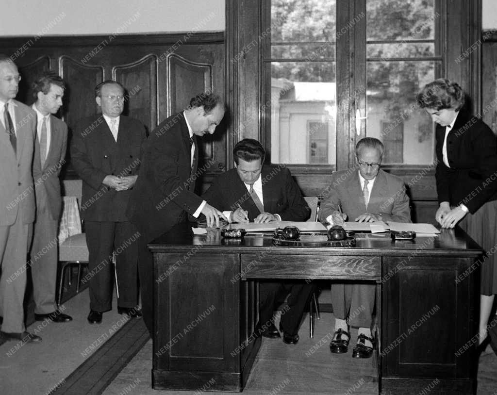 I. Sz. Csernyisov, a szovjet Rádió és Televízió Bizottság elnökhelyettese (b) és Gács László, a Magyar Rádió és Televízió elnöke aláírják a magyar-szovjet rádió és televízió egyezményt Budapesten.