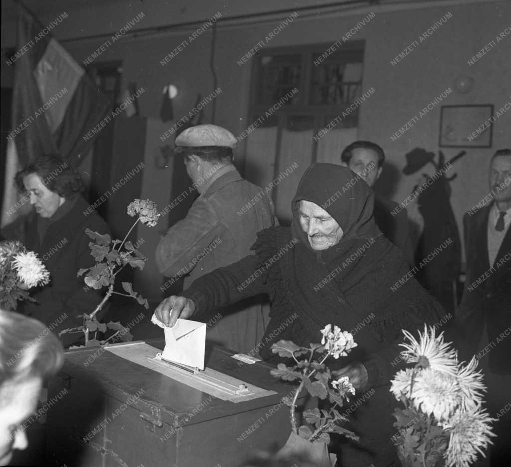 Özv. Dombai Jánosné nyugdíjas a pécsi 29-es választókörzetben leadja szavazatát. Az 1956-os forradalom után először tartották egyidőben az országgyűlési és tanácstagi választásokat. A Hazafias Népfront jelöltjeire országosan a szavazók 99,6 %-a adta le szavazatát.