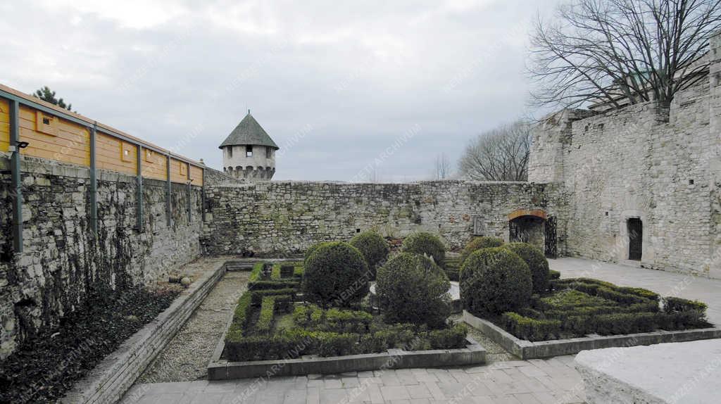 A Budai Vár déli részének belső kertje és a Buzogánytoronyhoz vezető várfal.