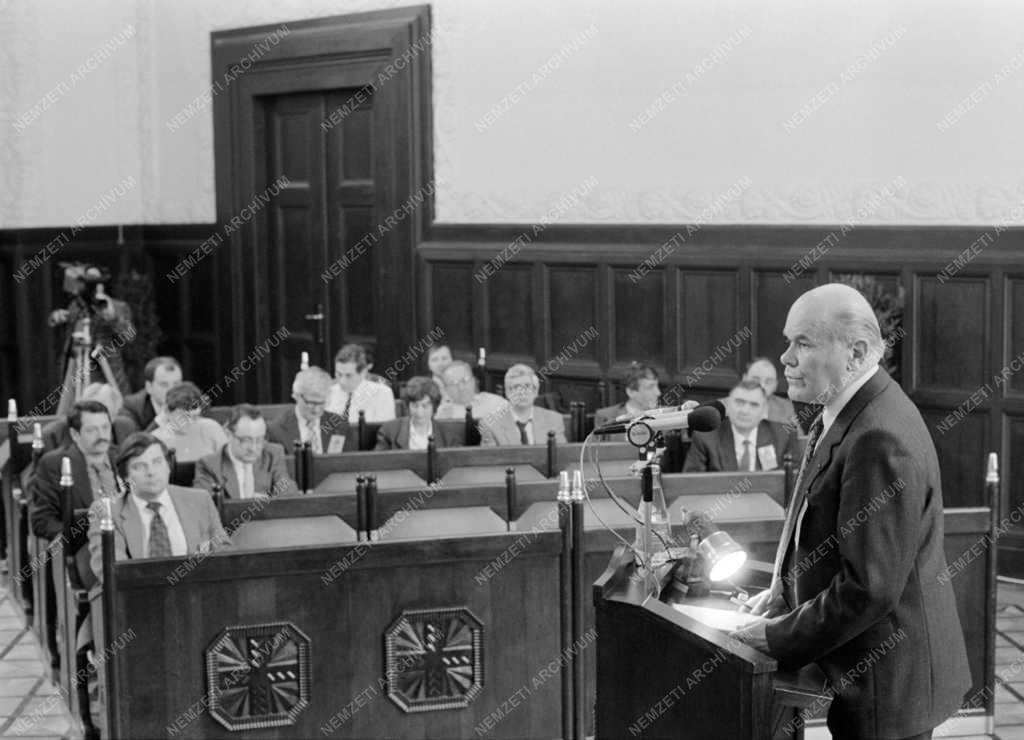A Politika és nyilvánosság címmel rendezett országos tanácskozáson Pálfy József (előtérben) újságíró, a Magyar Újságírók Szövetségének elnöke mond beszédet Debrecenben.