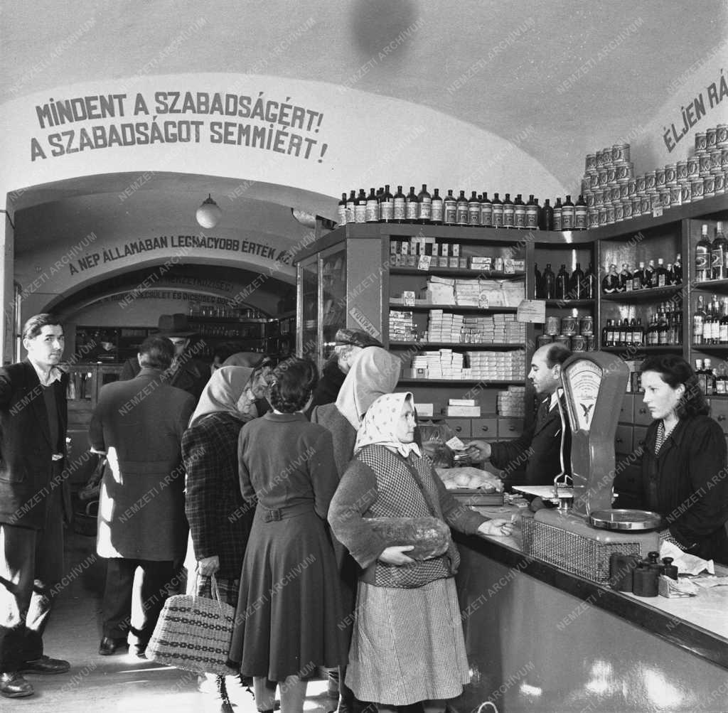 Eladók kiszolgálják a vásárlókat egy földműves-szövetkezeti üzletben.