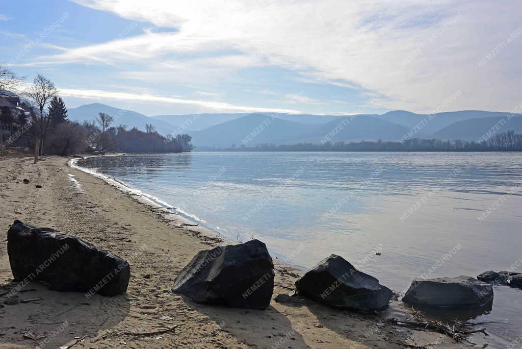 Látkép a Duna folyó bal partján, Pest megye északi részén, a Dunakanyarban fekvő település szabadstrandjáról a Visegrádi-hegységre, a Prédikálószék csúcsára.