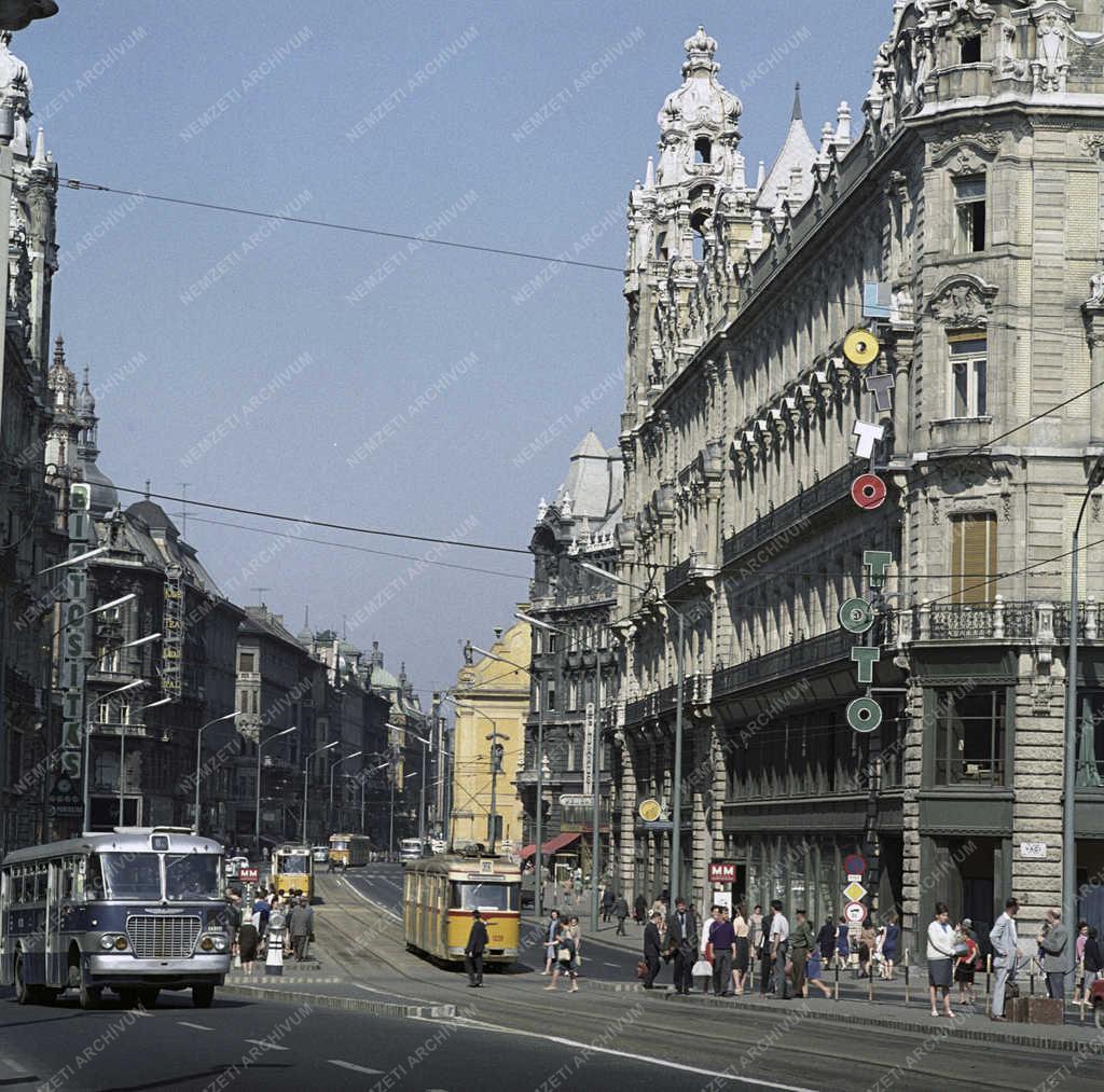 Forgalom az Erzsébet híd pesti hídfőjénél, a Szabad sajtó úton, a Kossuth Lajos utca folytatásán. Jobbra a 20. század elején átadott déli Klotild palota angol neobarokk, eklektikus épülete. Mögötte az Alcantarai Szent Péter-templom részlete a Felszabadulás téren (1991-től Ferenciek tere).
