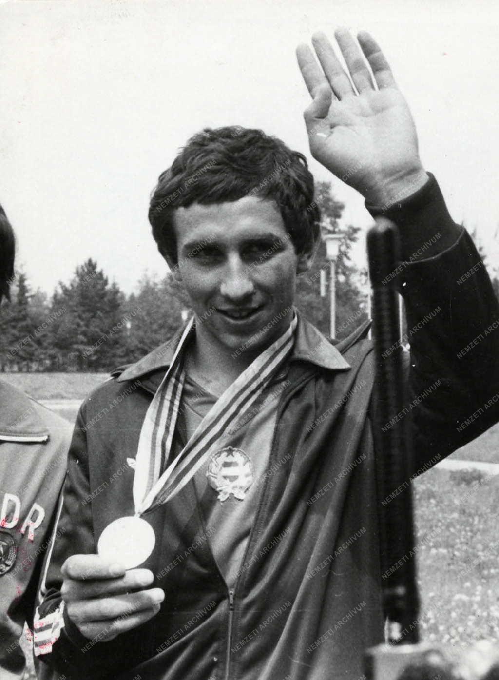 Varga Károly, nyakában aranyéremmel mosolyogva integet a XXII. Nyári Olimpiai Játékokon, ahol sportlövészetben a kisöbű sportpuska 60 lövéses fekvő testhelyzet számában 599 körös eredménnyel aranyérmet nyert.