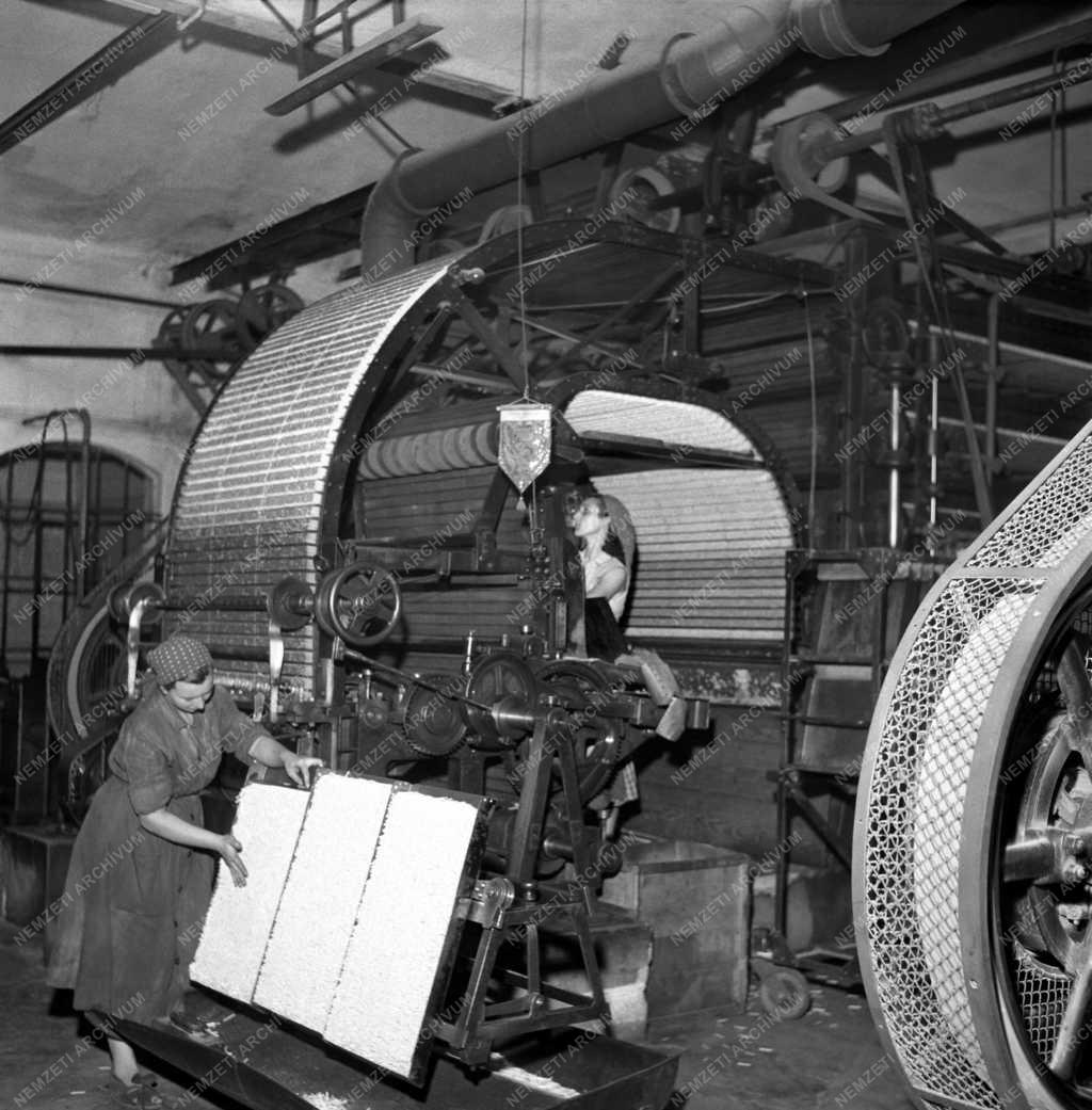 Jeges Ilona és Fehér Sándorné, a Zója brigád tagjai a mártógépen dolgoznak a Gyufaipari Vállalat budafoki telepén, ahol naponta 450 ezer doboz gyufát gyártanak.