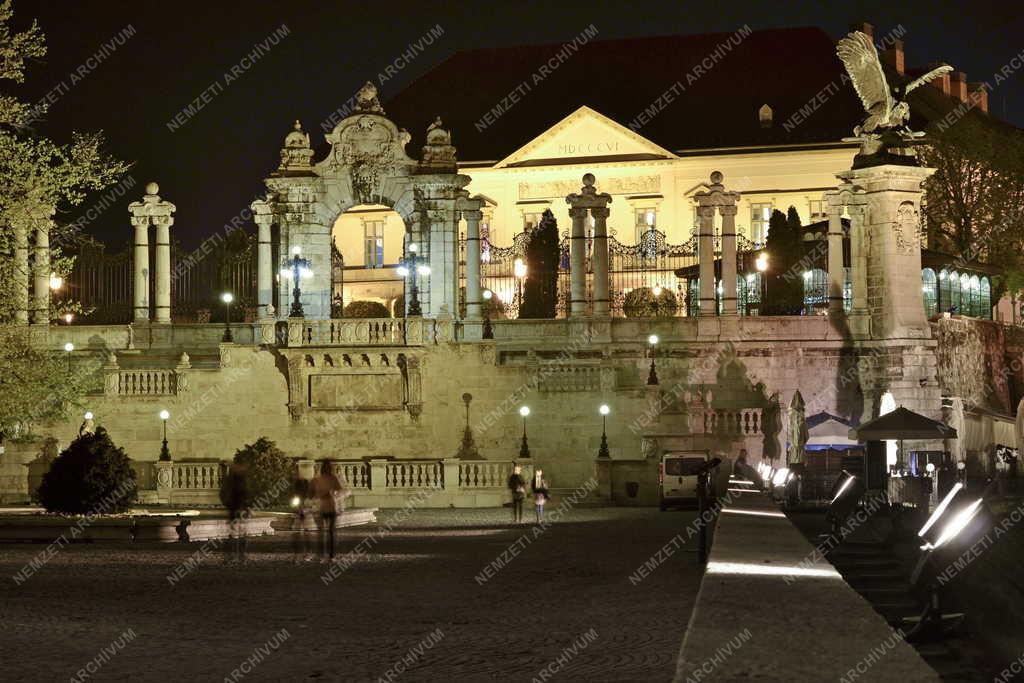 A Barokk- vagy Habsburg kapu a Szent György térnél esti kivilágításban. Jobbra a Turul-szobor, a háttérben a Sándor-palota részlete. A díszes műemlék kapun és a hozzá tartozó gazdag díszítésű lépcsősoron lehet megközelíteni a Halászó Fiú elnevezésű teraszt a Budavári Palotában.