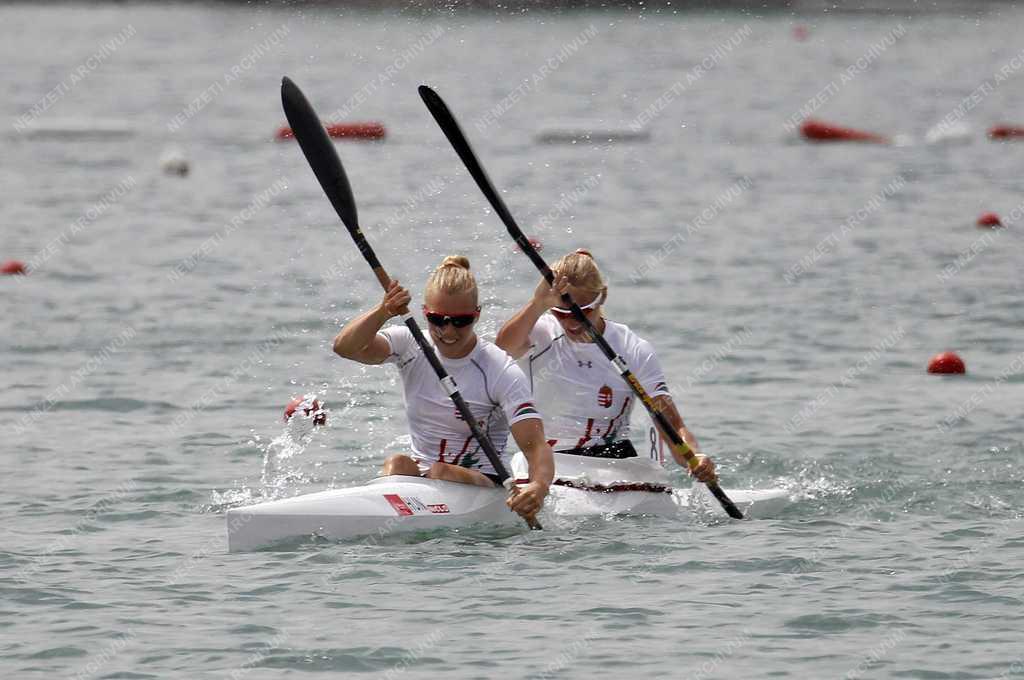 A bronzérmes Kárász Anna (b) és Vad Ninetta a bakui I. Európa Játékok női kajak kettes 500 méteres versenyének döntőjében a Bakutól mintegy 300 km-re, nyugatra fekvő Mingachevirben 2015. június 16-án.