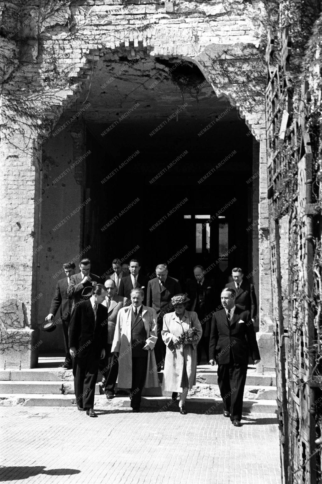 Tildy Zoltán (b2) köztársasági elnök és felesége Ortutay Gyula (b1), vallás- és közoktatásügyi miniszter társaságában, látogatásukat követően kijönnek a Néprajzi Múzeumból, a VIII. kerületi Könyves Kálmán körúton.