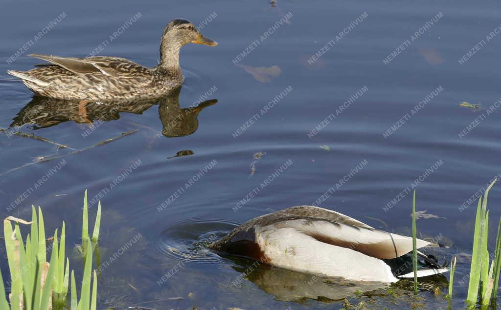 Tőkés réce (másként vadkacsa, Anas platyrhynchos) gácsér keres táplálékot fejével víz alá bukva a tavaszi Bikás park mesterséges kis tavában, miközben a párja figyeli munkáját. A Bikás park a főváros XI. kerületének, Újbudának egy közkedvelt, parkos területe amelynek közepén áll a mesterségesen kialakított Bikás-domb.