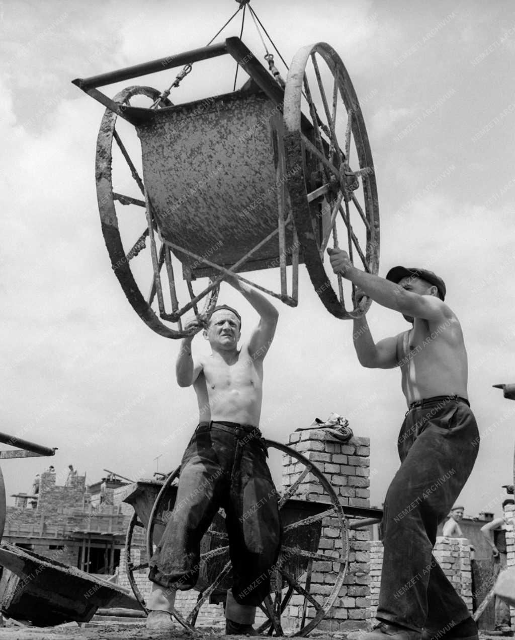 Az Építésügyi Minisztérium 45 sz. Építőipari Vállalatának dolgozói tartják a japánernek nevezett kétkerekű vaskordét, amit daruval emelnek a tetőre a Hévízi úti lakótelep építésénél. Idén közel 100 lakást adtak át és most is közel 200 lakás építésén dolgoznak.