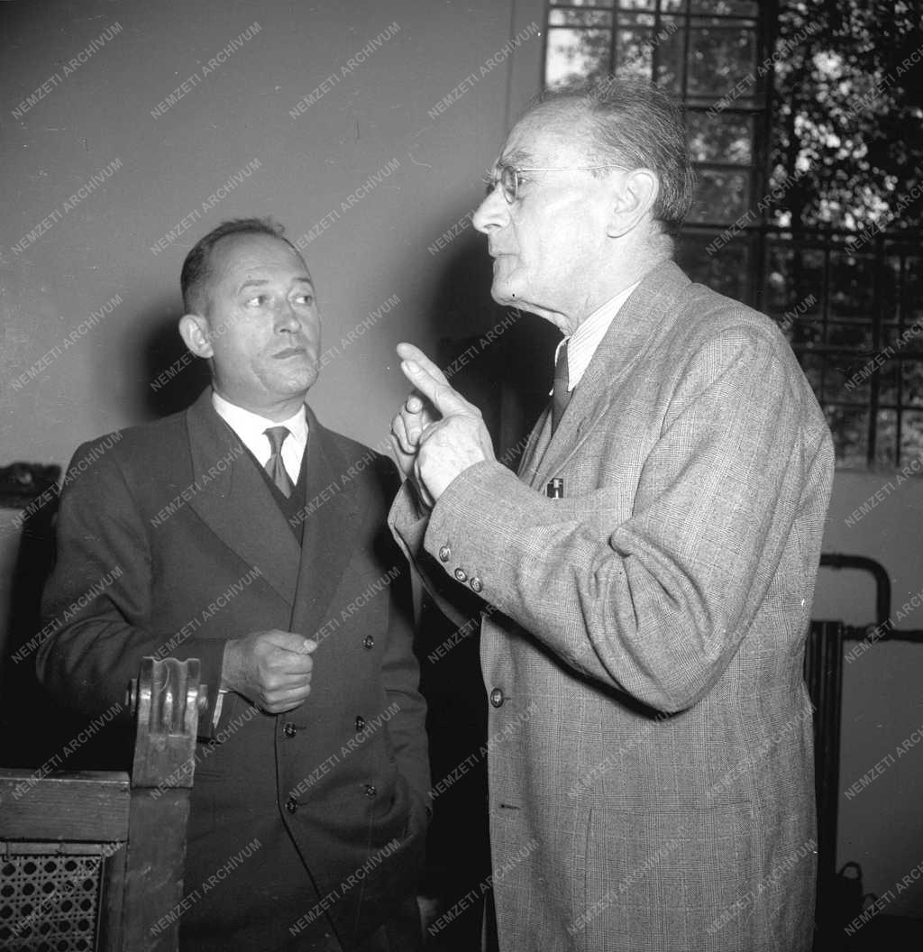 Pierre Seghers francia író és Pór Bertalan Kossuth-díjas festőművész beszélgetnek egymással, amikor a francia vendég látogatást tesz a magyar képzőművész műtermében.