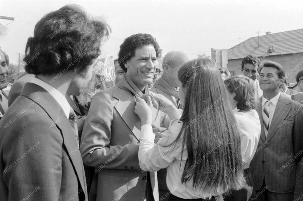 Moamer el-Kadhafi (b2) nyakába nyakkendőt köt egy úttörő kislány, amikor a líbiai forradalom vezetője – aki Kádár Jánosnak, a Magyar Szocialista Munkáspárt Központi Bizottsága (MSZMP KB) első titkárának és Losonczi Pálnak, az Elnöki Tanács elnökének meghívására hivatalos, baráti látogatáson tartózkodik hazánkban – kíséretével a zagyvarékasi Béke Termelőszövetkezetbe látogat.