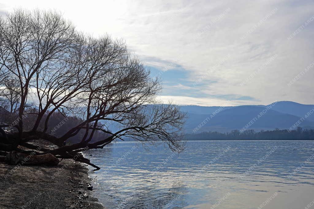 Látkép a Duna folyó bal partján, Pest megye északi részén, a Dunakanyarban fekvő település szabadstrandjáról a Visegrádi-hegységre.