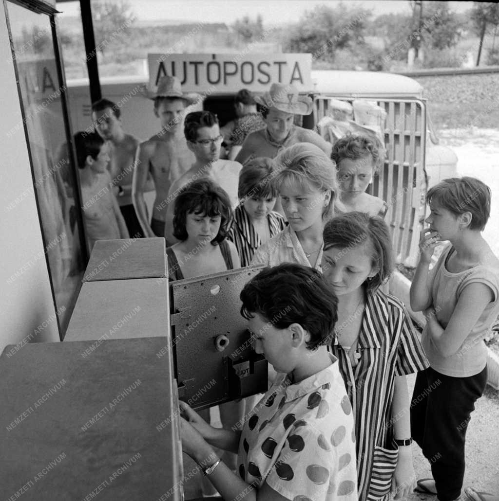A képeslapokat és postabélyeget árusító automatákat tölti fel a sorban várakozó nyaralók mellett a Magyar Posta új, egy kelet-német gyártmányú Barkas B1000 típusú kis-teherjárművében működő mozgó postahivatal dolgozója a Balatonudvari község mellett Kiliántelep néven létesült üdülőtelep kempingjében. Az úgynevezett autóposta, a balatoni campingezők eddigi levelezési gondjain segít. A jármű minden nap meglátogatja a lakott területektől távol eső sátortáborokat és gondoskodik arról, hogy a nyaralók üdvözlőlapja késedelem nélkül eljuthassanak a címzettekhez. Az autóposta magyar és külföldi kiadású újságokat és képeslapokat is árusít.