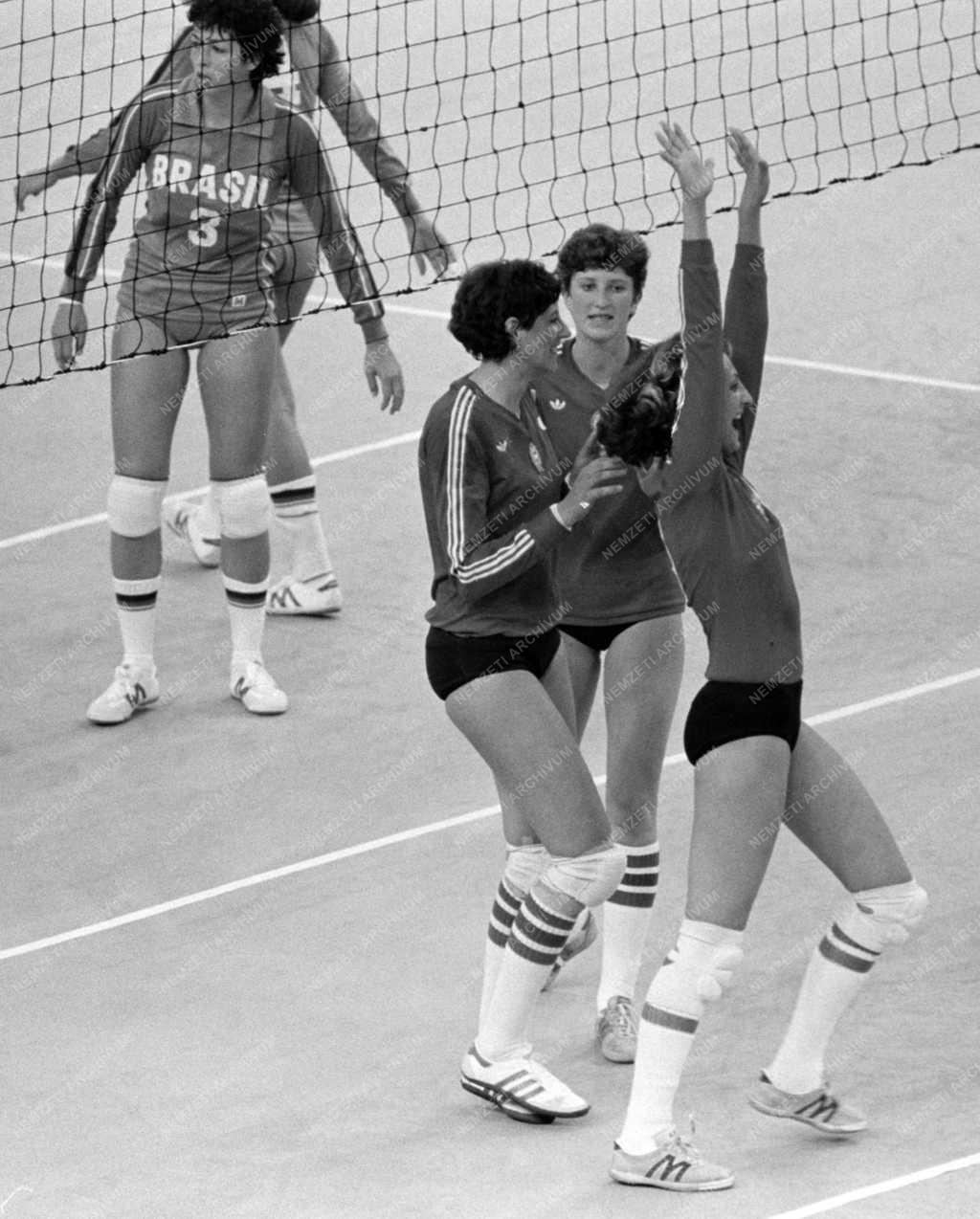 A Magyarország-Brazília női röplabdamérkőzésen egy megnyert pontnak örülnek a magyar válogatott tagjai. Végeredmény: 3:2