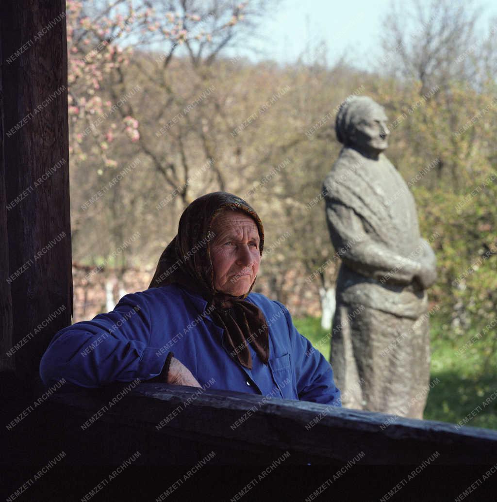 Fejkendős asszony egy kőszobor mellett az etari falumúzeumban.