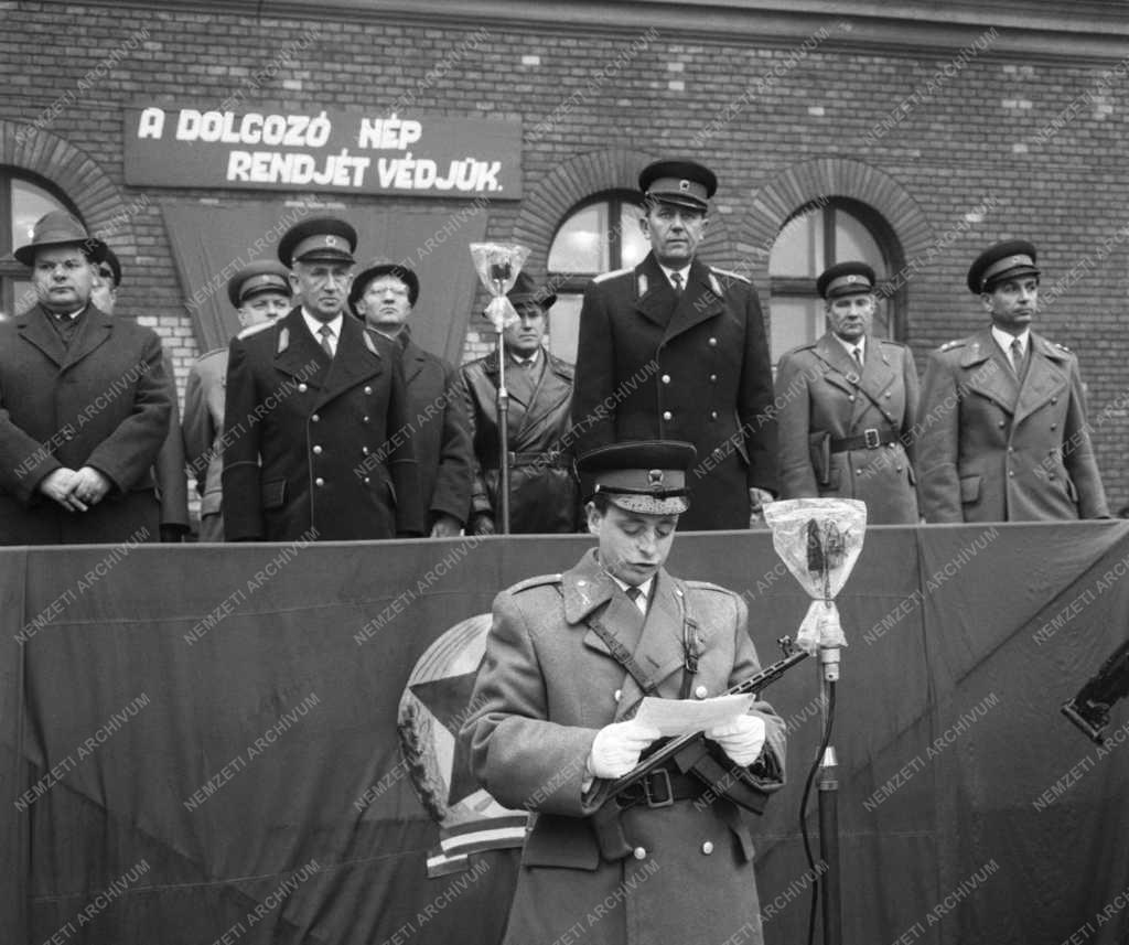 A Budapesti Rendőr-főkapitányság új tiszthelyettesei ünnepélyes eskütételén, a Mosonyi utcai rendőrlaktanya udvarán. Az ünnepségen megjelent dr. Kőrösi György rendőr vezérőrnagy, belügyminiszter-helyettes és dr. Sós György rendőr vezérőrnagy, budapesti főkapitány.
