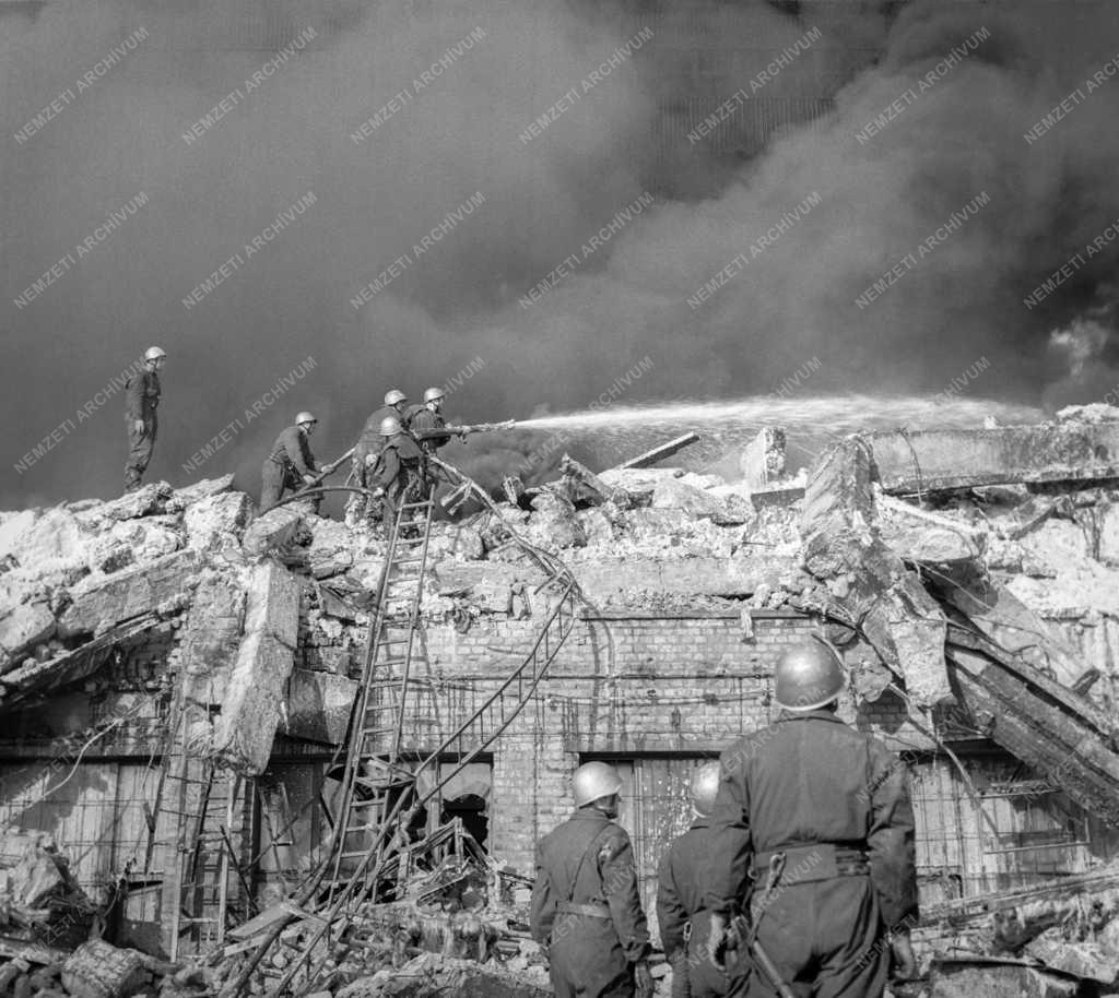 Tűzoltók dolgoznak a Ruggyantaárugyár gumilágyító üzemében keletkezett tűz oltásán. A tűz megfékezése során a Ruggyantaárugyár két dolgozója és három tűzoltó sérüléseket szenvedett, akiket a mentők kórházba szállítottak.