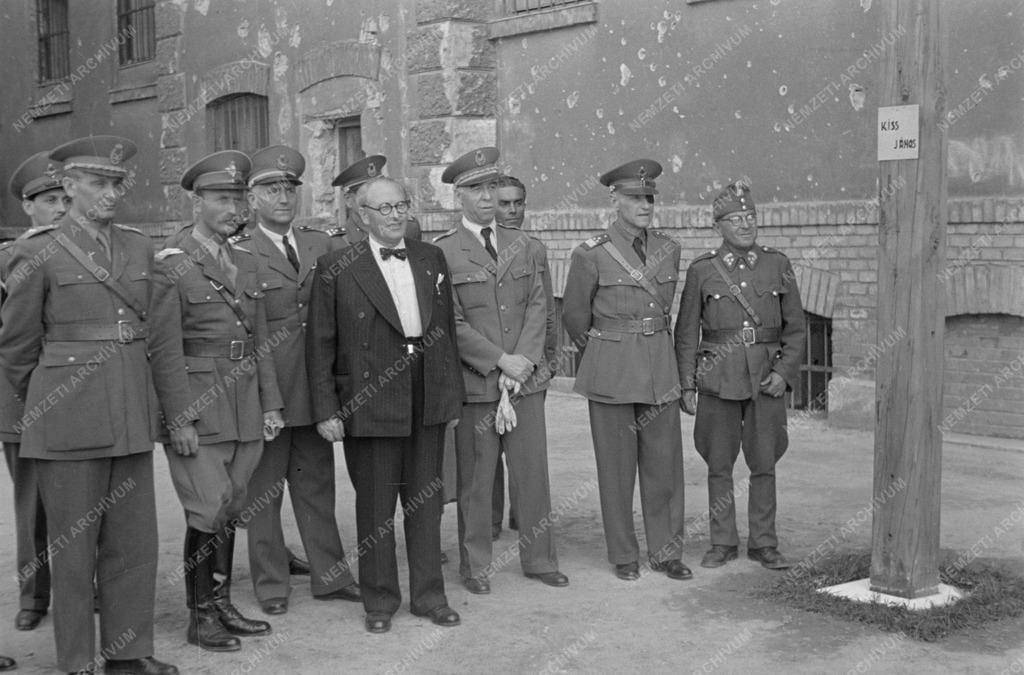 A Magyar Partizánok Bajtársi Szövetségének tagjai a Mártírok úti katonai fogházban teszik tiszteletüket Kiss János altábornagy emlékműve előtt. Az altábornagyot, a Nemzeti Felkelés Felszabadító Bizottsága Katonai Vezérkarának vezetőjeként a nyilasok elfogták és 1944. december 8-án a fogház épületében kivégezték