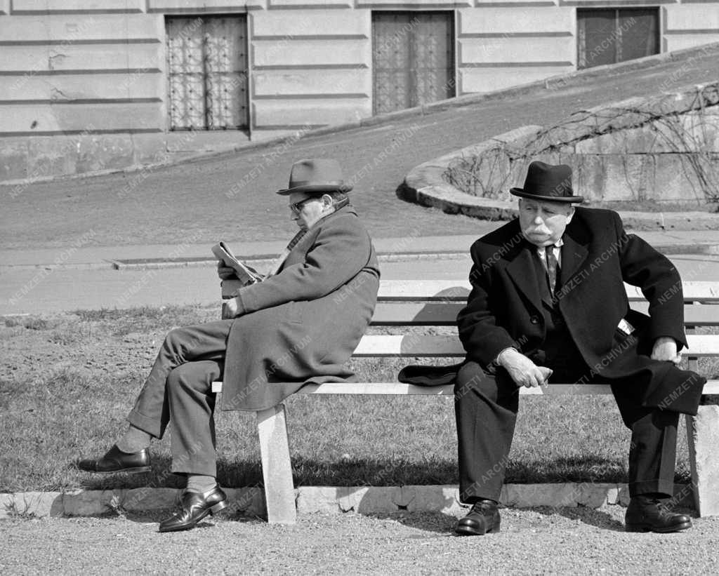 Két férfi ül egy padon a tavaszi napsütésben a szegedi Móra Ferenc Múzeum előtt.