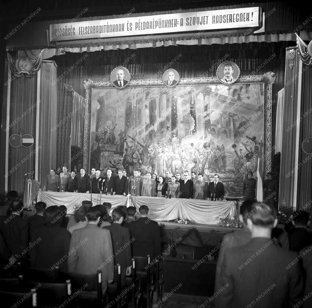 A Szovjet Hadsereg 33. születésnapján a Magyar-Szovjet Társaság és a honvédség szervezésében ünnepséget tartanak a Városi Színházban. A rendezvény díszelnökségében párt- és kormányvezetők foglalnak helyet.