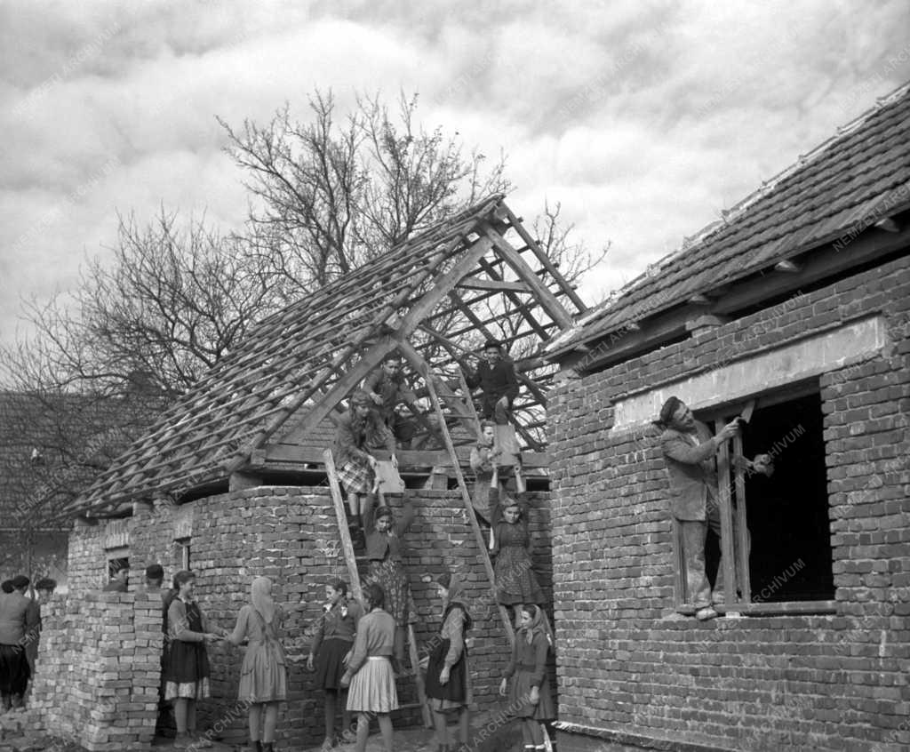 A bodaki iskolások adogatják a tetőcserepeket az egyik ház építésénél az árvíz után.