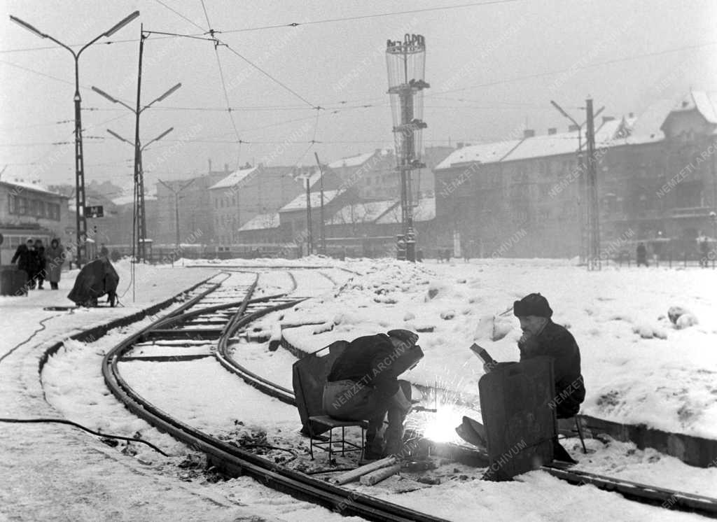 Munkások hegesztik a villamossínt a havas Moszkva téren.