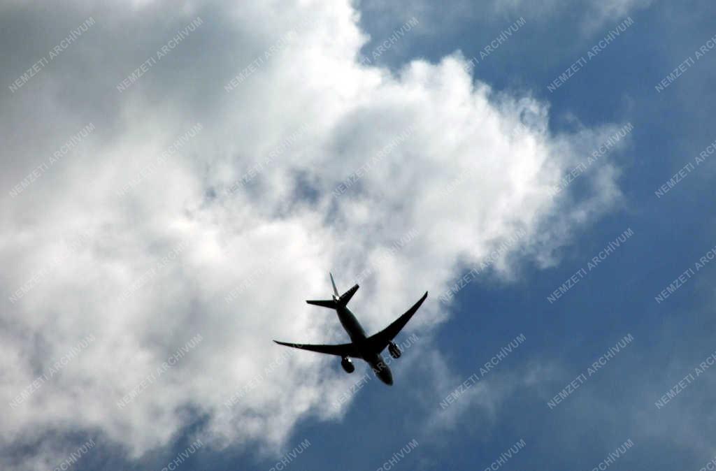 Gomolyfelhős égre felszállt Boeing 787 Dreamliner utasszállító repülőgép a magyar főváros délnyugati részének egén.