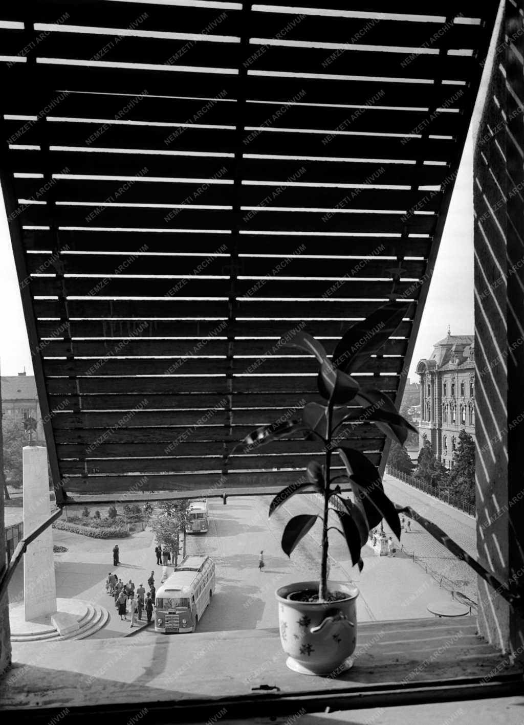 Pillanatkép a győri Városház térről egy kitámasztott redőnyös ablakból nézve. Az ablakban porcelán kaspóban egy fikusz áll.
