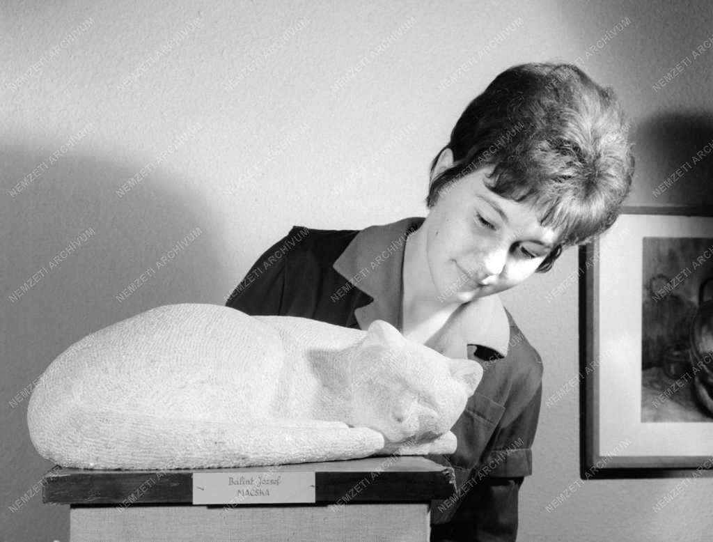 Egy érdeklődő nézi Bálint Józsefnek, a szegedi ipari szakközépiskola tanulójának fekvő macskát ábrázoló márványfaragását, az Első Országos Diák Képzőművészeti Kiállításon, Hódmezővásárhelyen, a Tornyai János Múzeumban.