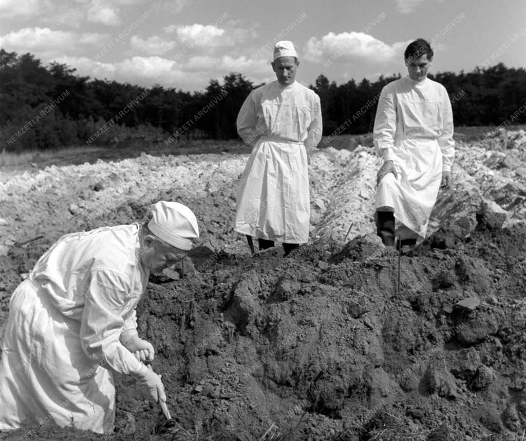 Karai Gusztáv, az Erdészeti Tudományos Intézet (ERTI) Izotóplaboratóriumának vezetője (b) izotópos oldattal kezeli a felszántott talajt. Az intézetben a Kölcsönös Gazdasági Segítség Tanácsa (KGST) megbízásából kísérleteket folytatnak a mélyszántó ekékkel. Három ekefajta - egy szovjet, egy kelt-német (Német Demokratikus Köztársaság - NDK és egy magyar újítással átalakított szovjet talajművelő eszköz - teljesítményét próbálják ki. A mélyszántás után a kutatók a foszfor 32 típusú béta-sugárzó radioaktív anyaggal öntözött földből mintát vesznek és ez alapján állapítják meg a laboratóriumban, hogy az elkeveredés milyen arányú. A másik fontos kísérlet a talajsűrűség mérés a kobalt-60 sugárforrás alkalmazásával.